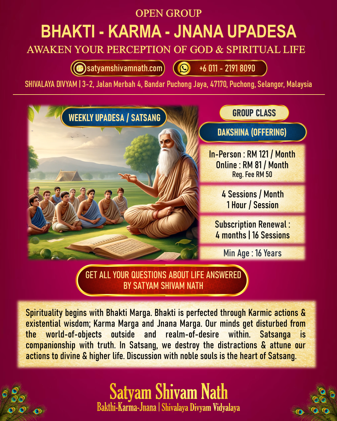 Satsanga means companionship with truth. Constant discussion with noble souls is the heart of Satsang. Individual spiritual paths may vary according to Karma but Satsang is the only way to begin a spiritual path.