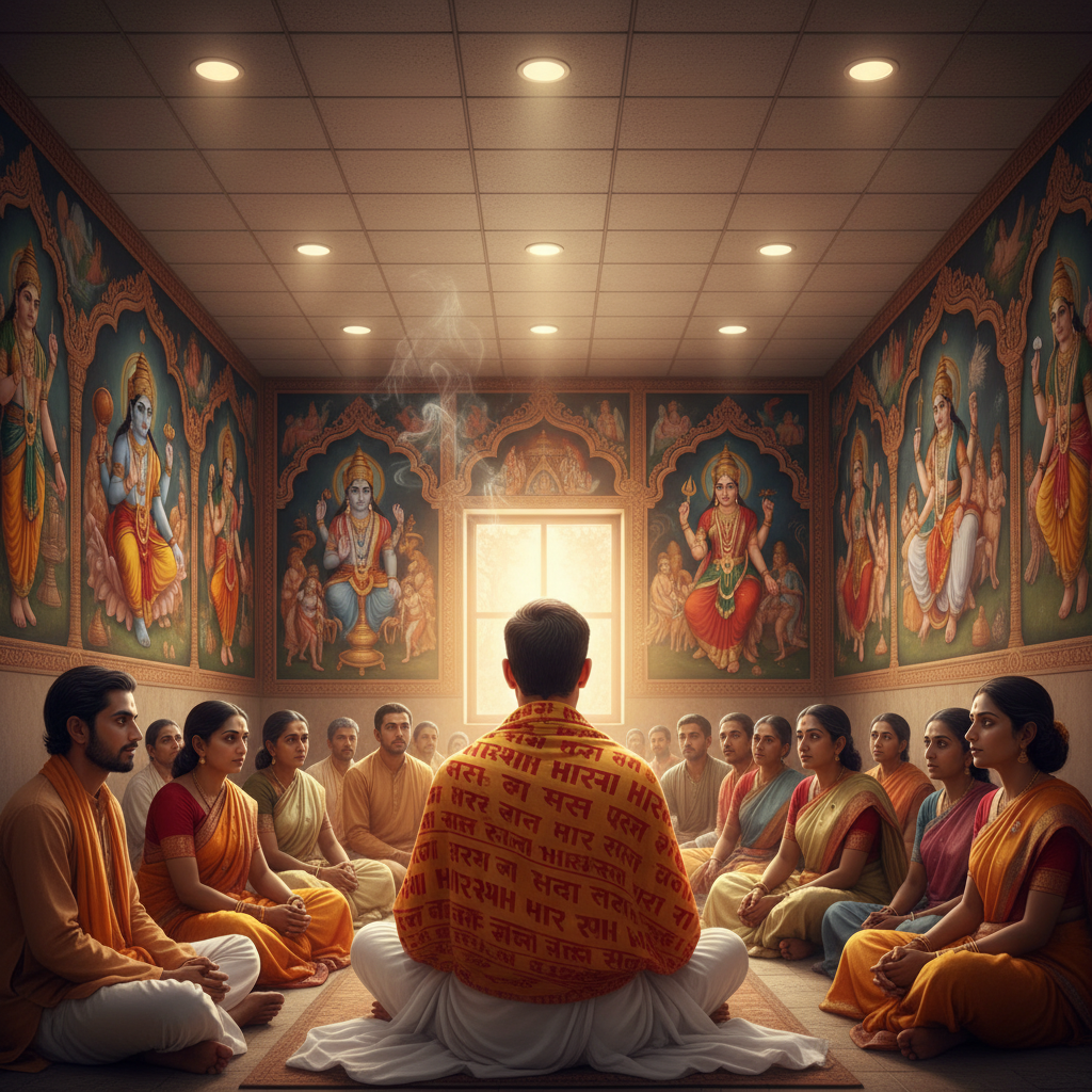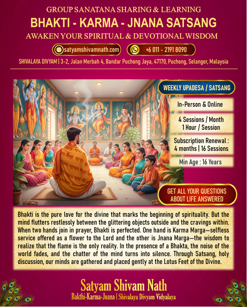 Bhakti is the pure love for the divine that marks the beginning of spirituality. But the mind flutters restlessly between the glittering objects outside and the cravings within. When two hands join in prayer, Bhakti is perfected. One hand is Karma Marga—selfless service offered as a flower to the Lord and the other is Jnana Marga—the wisdom to realize that the flame is the only reality. In the presence of a Bhakta, the noise of the world fades, and the chatter of the mind turns into silence. Individual spiritual paths may vary according to Karma but Satsang is the only way to begin a spiritual path. Through Satsang, holy discussion, our minds are gathered and placed gently at the Lotus Feet of the Divine.