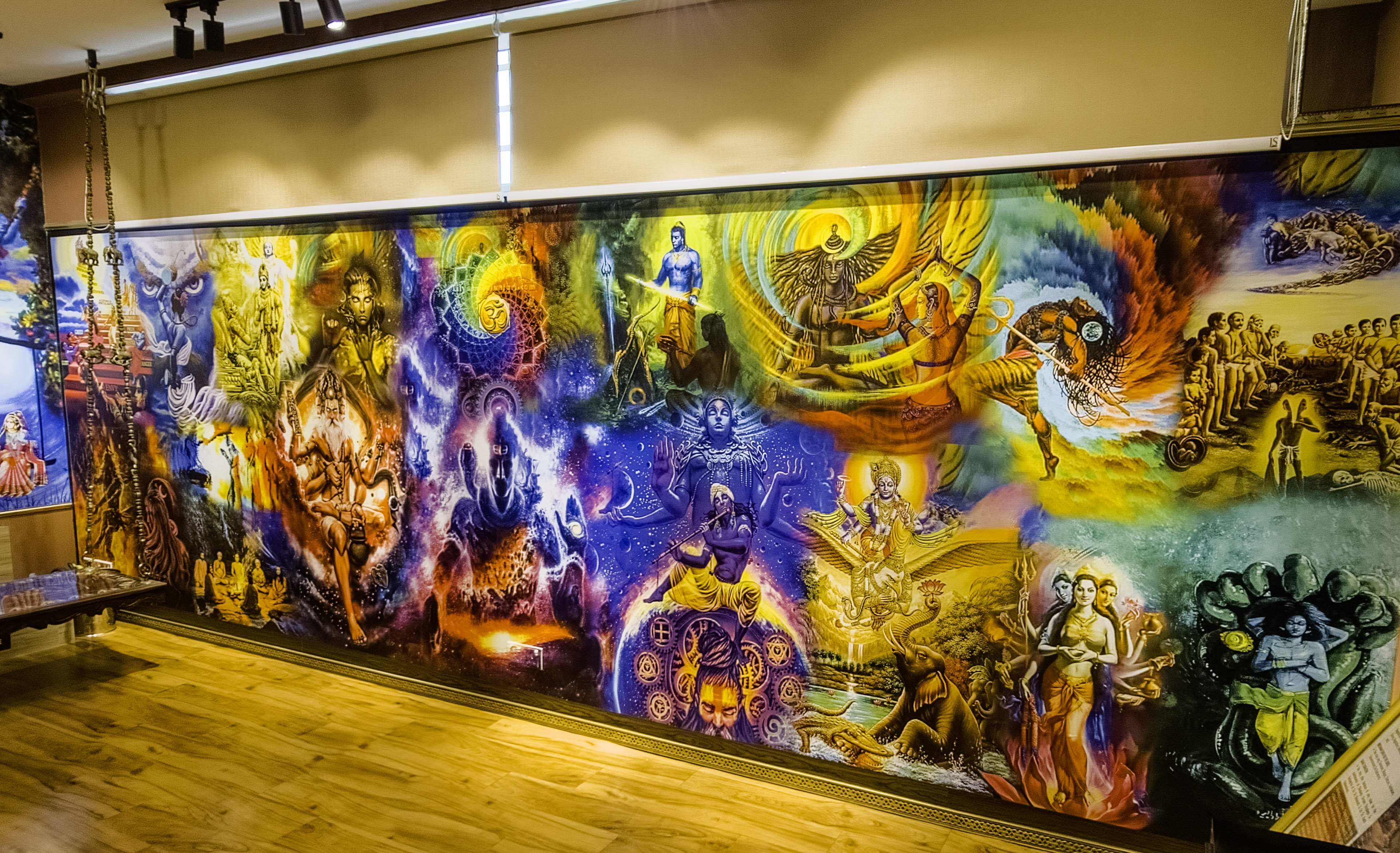 Shiva Hall is the larger hall for larger group. It can comfortably accommodate 50 to 70 clients for satsang or upadesa. It can also accommodate 15 to 20 Yoga mats for holistic health classes. The hall is designed with more ugra or fiery energy of Lord Shiva & Dasamahavidya for learning, seeking, & discipline. There will be a sense of motivation, & vairagya for sadhana as soon as one enters the hall.